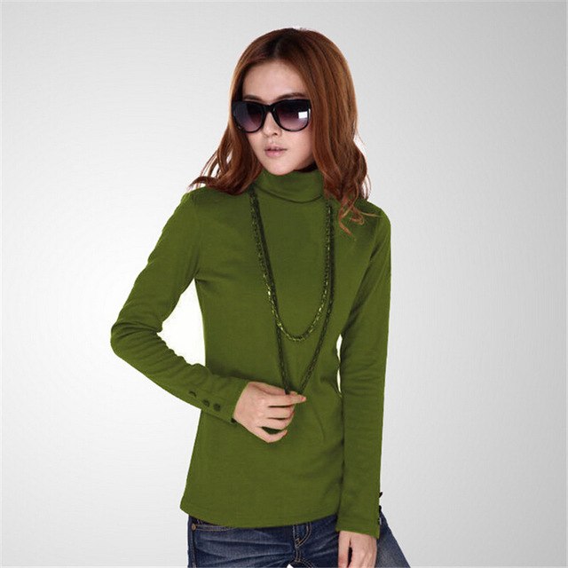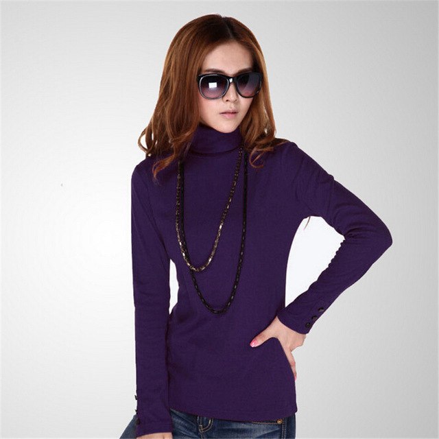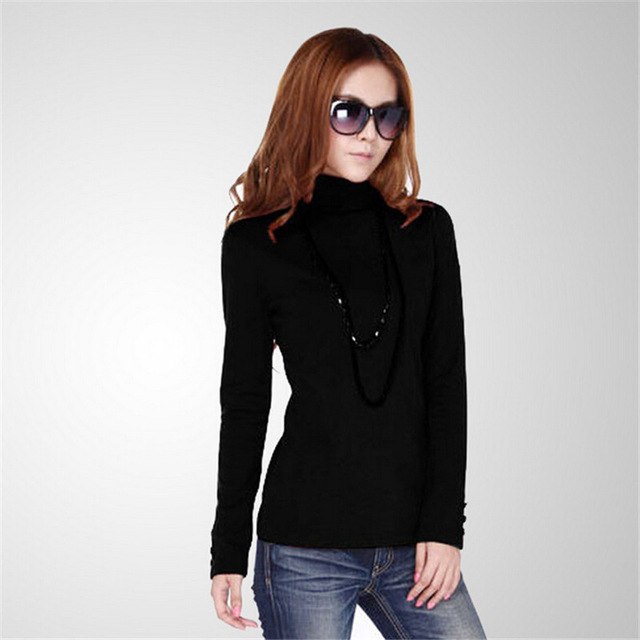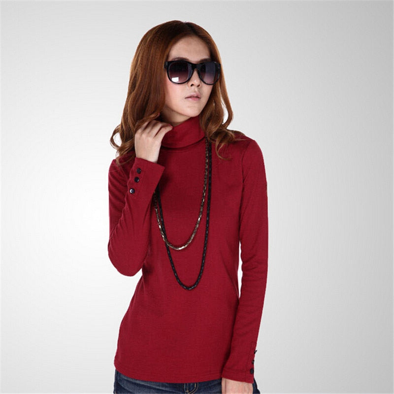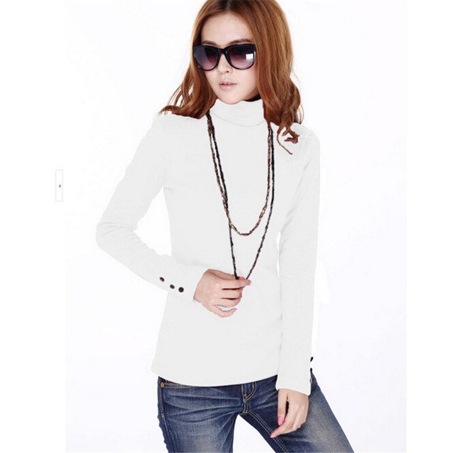 Autumn Turtleneck Women T-shirt Sleeve Button Plus Size M-4XL T shirt Pure Color Casual Tshrit Female Cotton T shirt Tops 31976