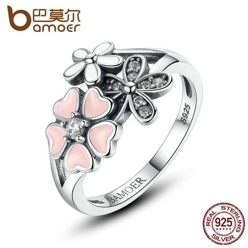 BAMOER 925 Sterling Silver Pink Flower Poetic Daisy Cherry Blossom Finger Ring for Women Engagement Fashion Jewelry SCR004