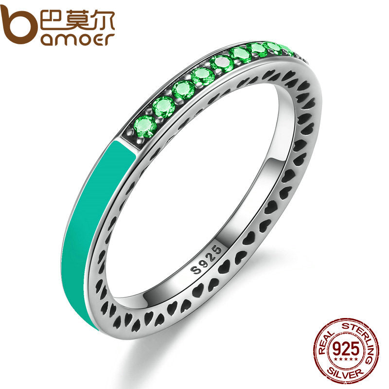 BAMOER 925 Sterling Silver Radiant Hearts Bright Mint Enamel & Royal Green Crystals Women Ring Engagement Jewelry PA7619