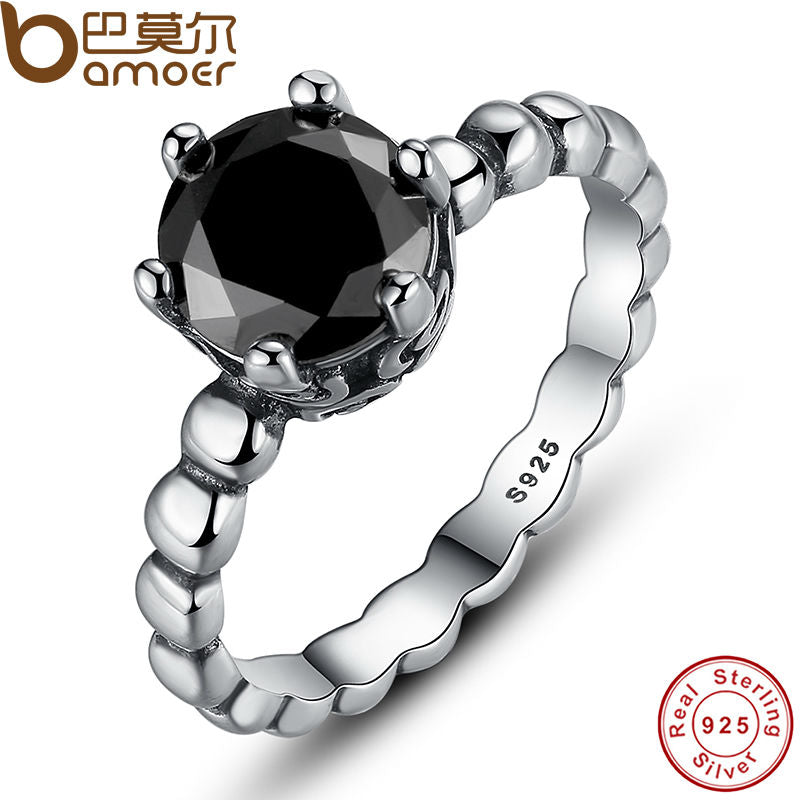 BAMOER Genuine 100% 925 Sterling Silver Ring with Black Cubic Zirconia For Women Wedding Jewelry PA7109