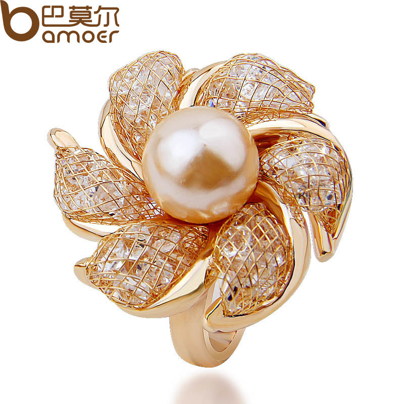 BAMOER High Quality Rose Gold Color Imitation Pearl Ring for Women Anniversary Made with AAA Zircon Luxury Jewelry JSR007