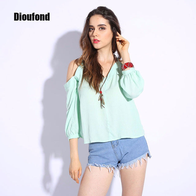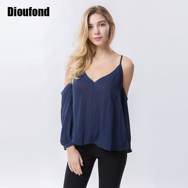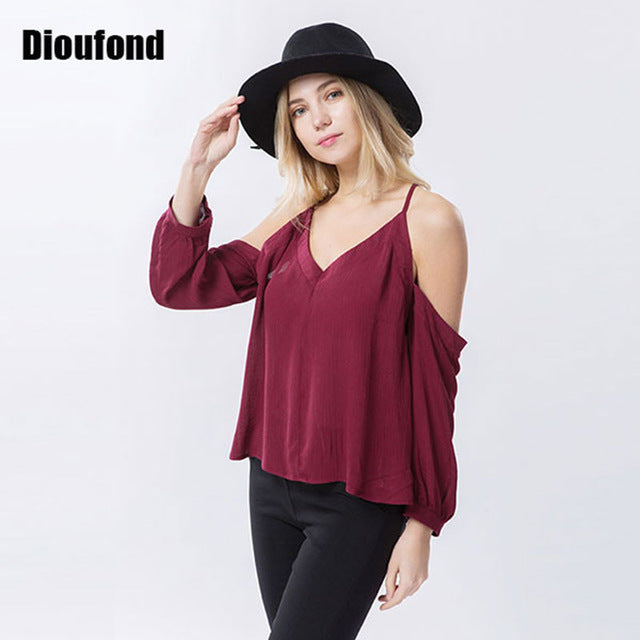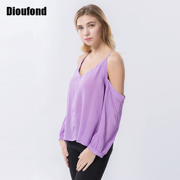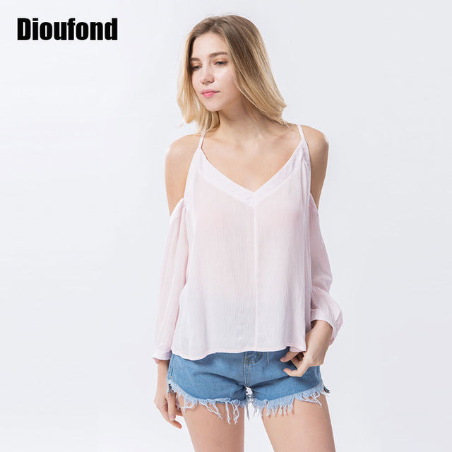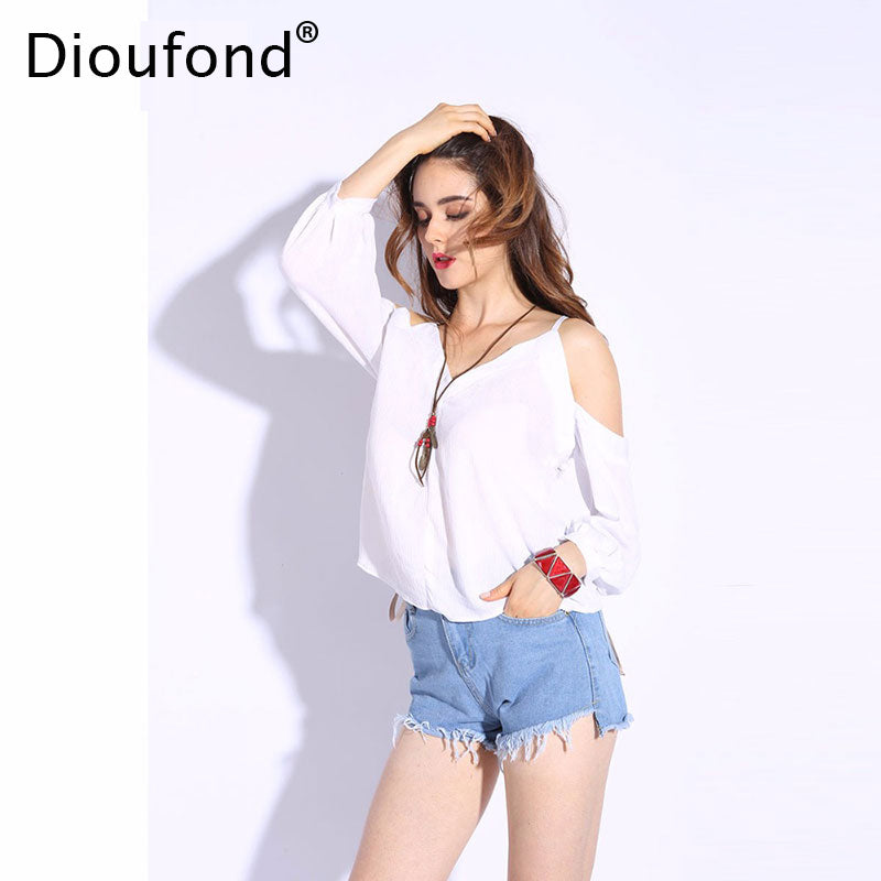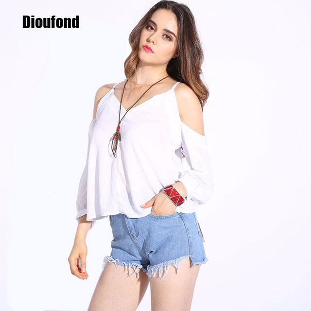 Dioufond 2017 Summer T shirt Women Off Shoulder V-neck T-shirts Crinkle White Tops Casual Split Spaghetti Strap Tshirt