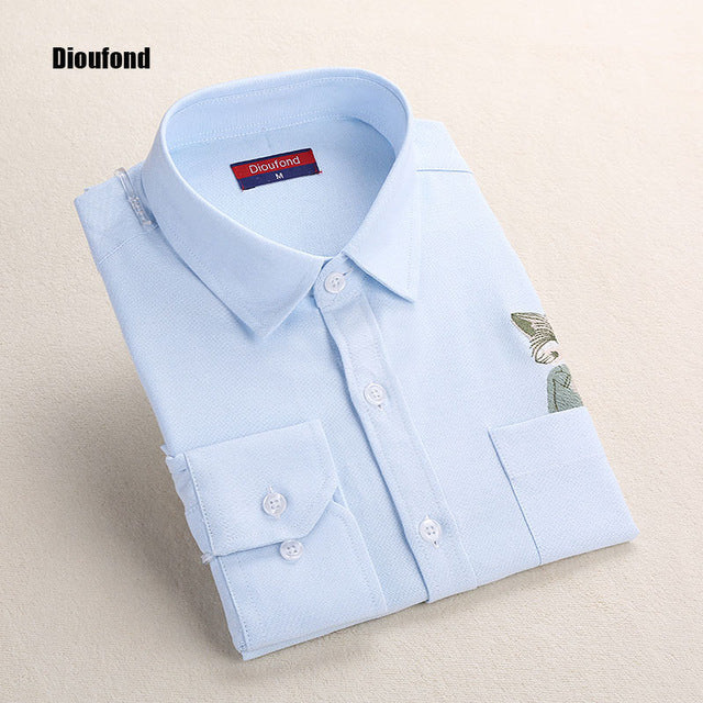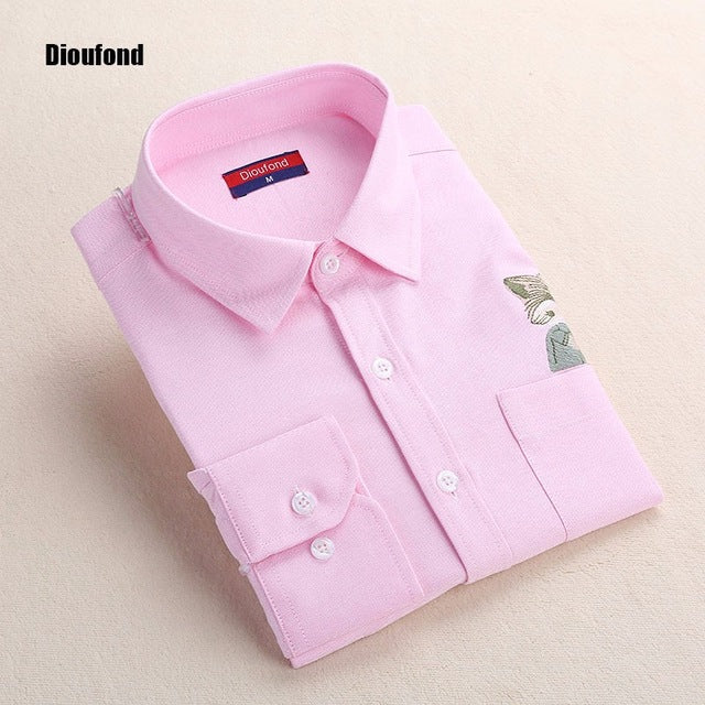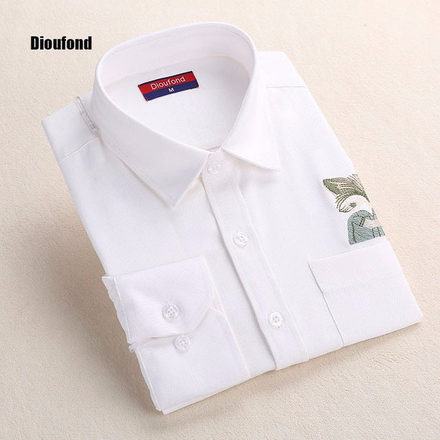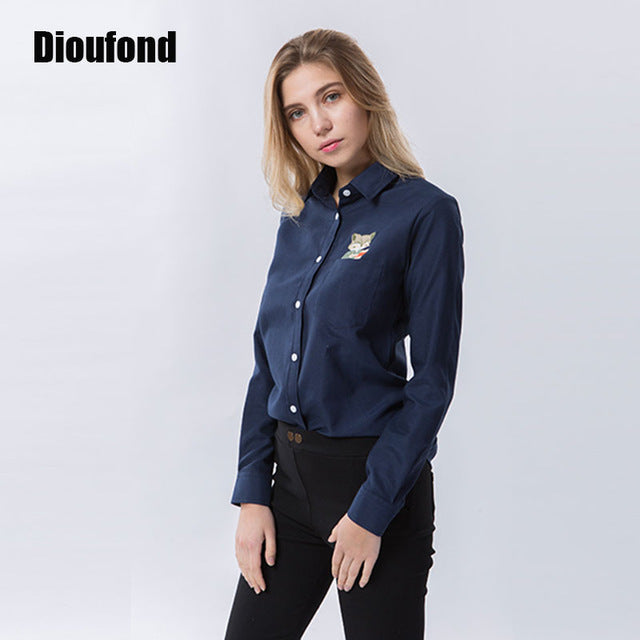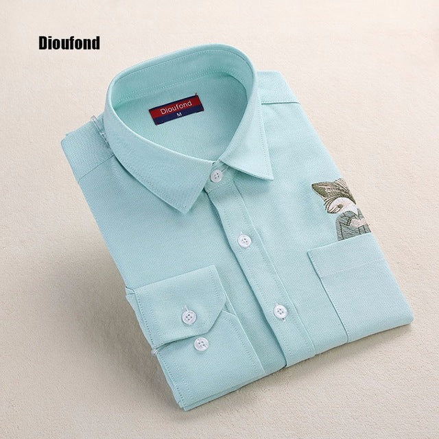 Dioufond Animal Embroidery Print Fox on Pocket Shirts Lady 2017 Spring New Fashion White Blouse Shirts Women Long Sleeve Tops