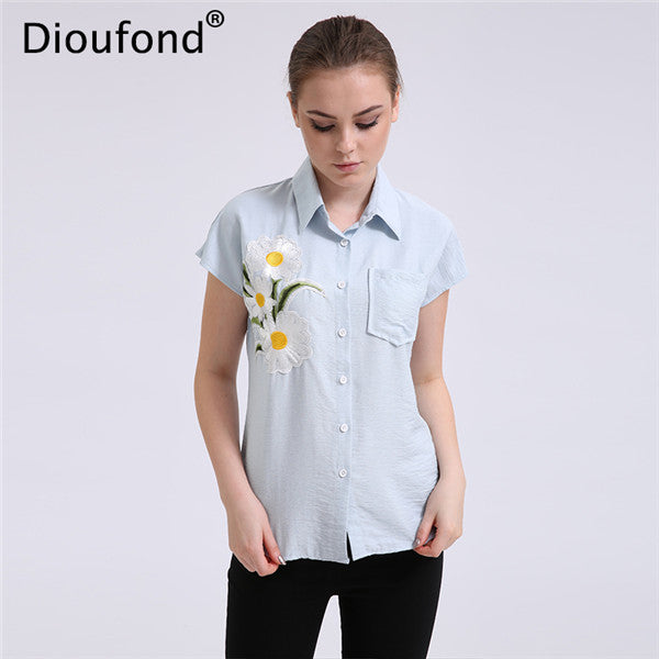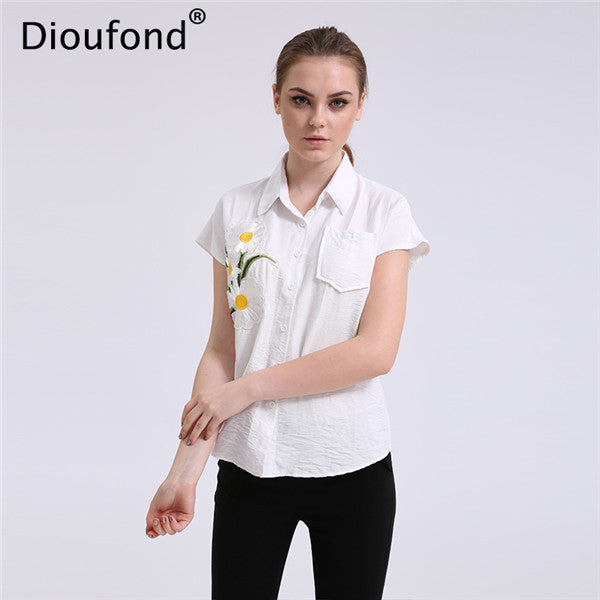 Dioufond Floral Navy Short Sleeve Women Blouses Casual Fashion Appliques White Loose Style Summer Blusas Femininas 2017