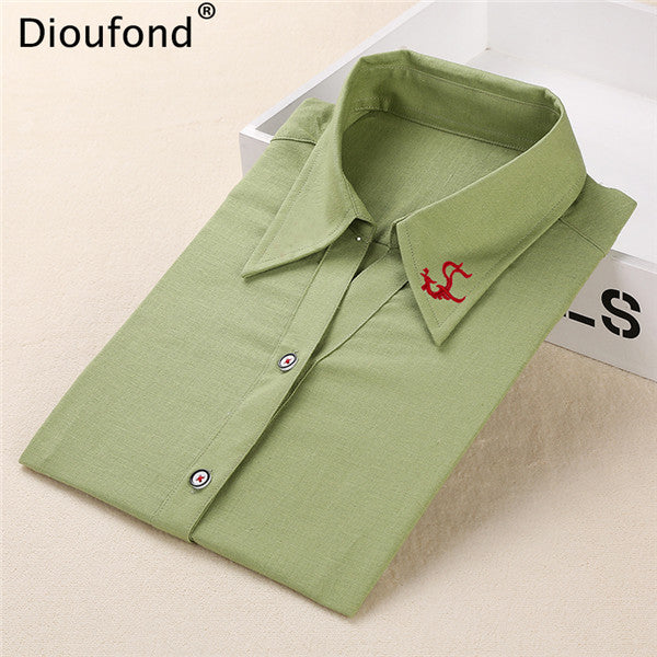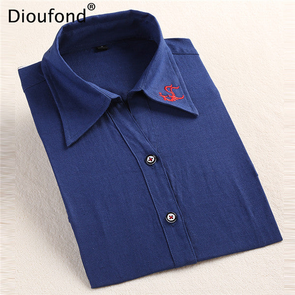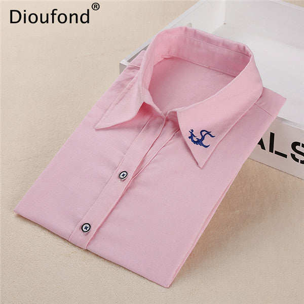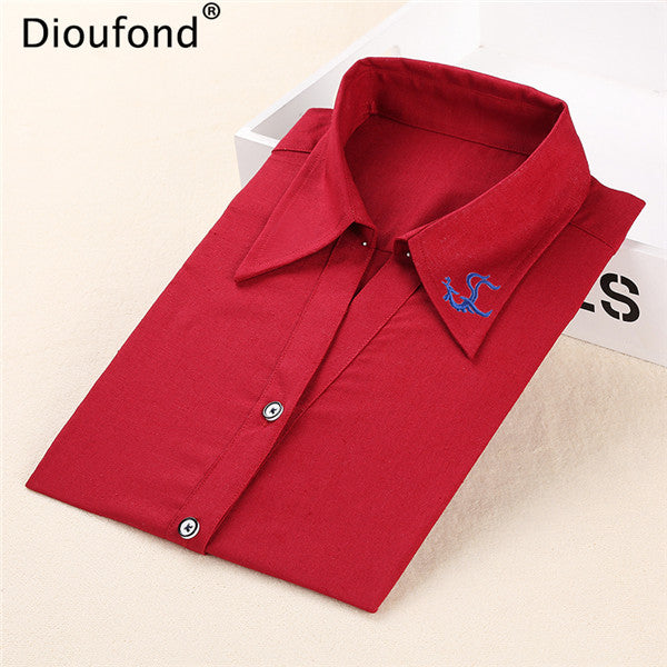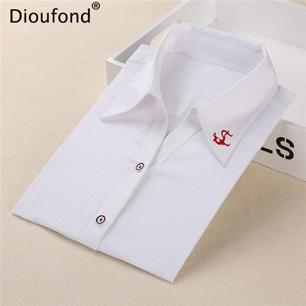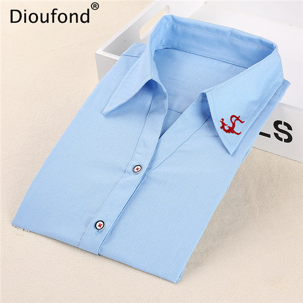 Dioufond Office Women Blouses Ladies Office Shirts Work Wear Long Sleeve Blouses For Ladies V-Neck White Embroidery Shirts