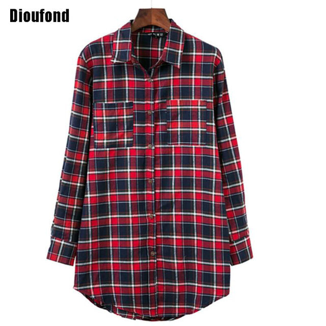 Dioufond Women Blouses Korean Fashion Cardigan Cotton Blouse Women Shirts Casual Red Plaid Shirts Long Shirts Loose Blusas Tops