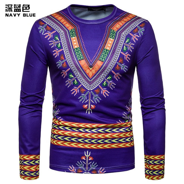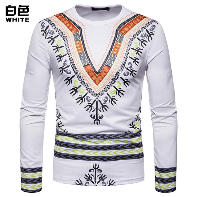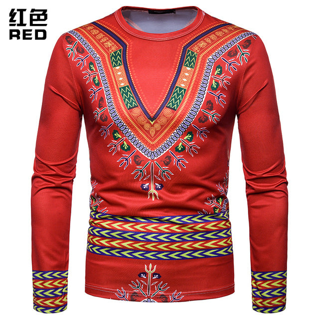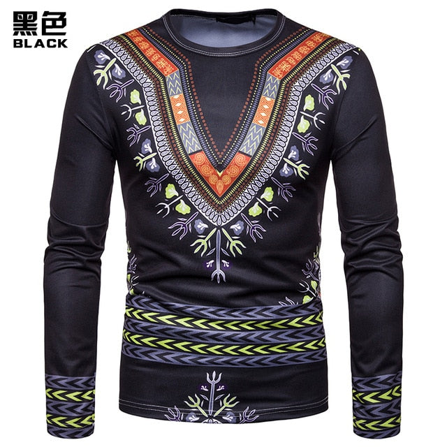 Personality Casual 3D Printed National Africa Clothing Round Neck Long Sleeved Hip Hop Style T Shirt Men