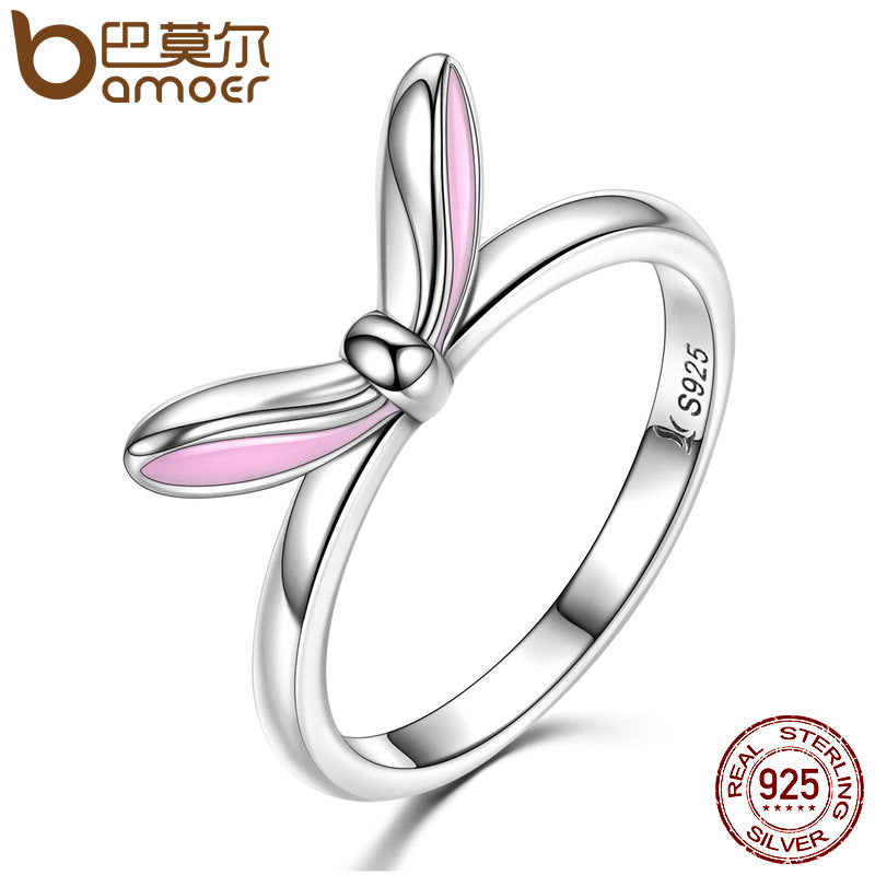 BAMOER Authentic 925 Sterling Silver Sweet Pink Enamel Rabbit Ears Finger Rings For Women Fashion Sterling Silver Jewelry SCR058