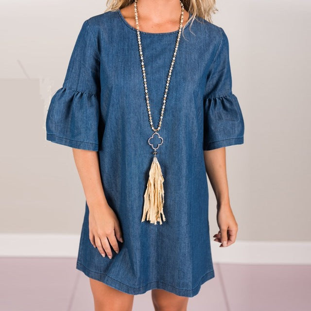 Women Ladies Fashion Flared Ruffled Flounce Sleeve Denim Blue Jean Look Vintage Retro Shirt Dress Mini Short Vestido